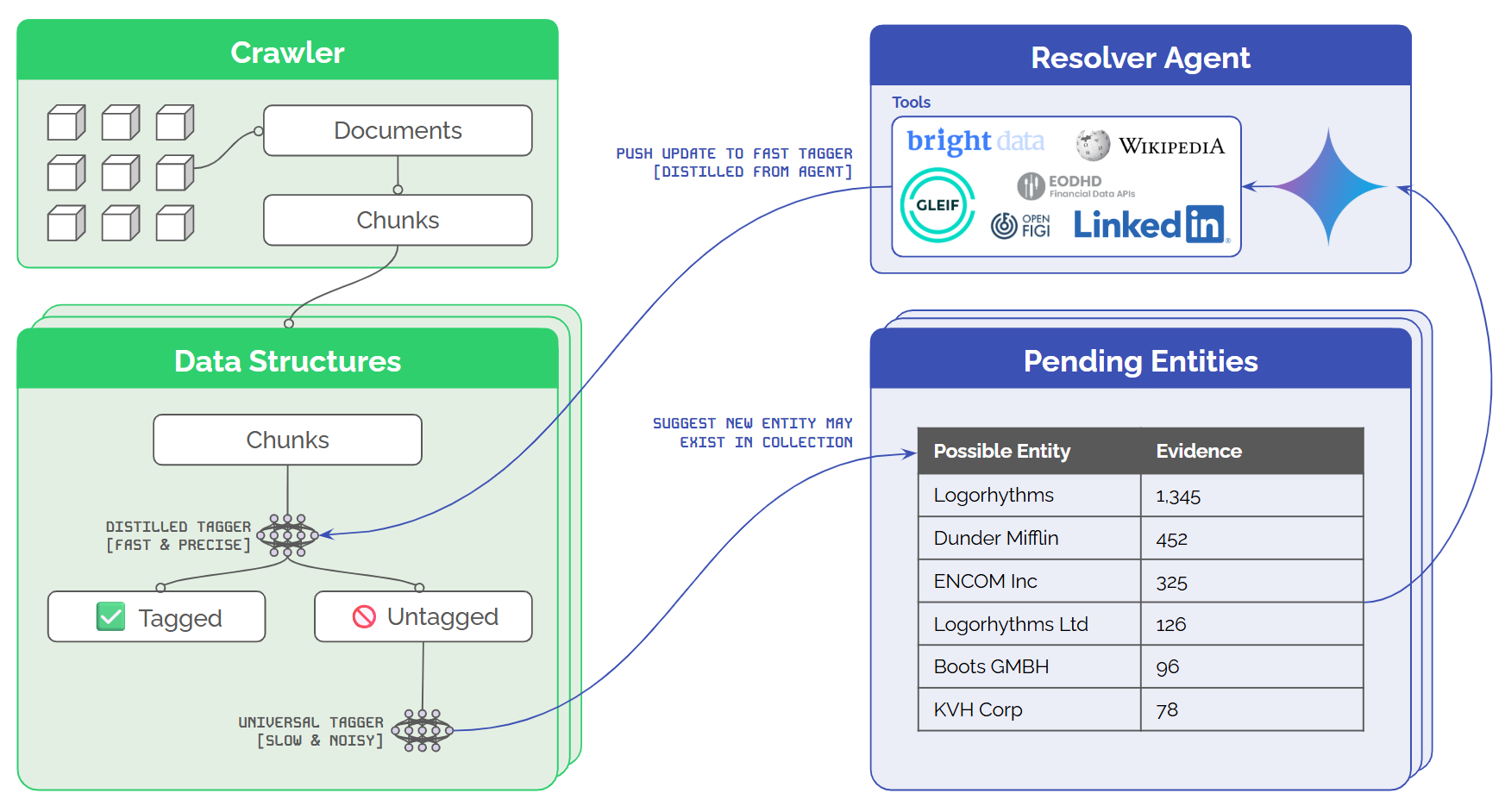 • The Resolver Agent uses a bunch of tools (Search, Wikipedia, LinkedIn, Market APIs, etc.) to work out who this entity is. This step is obviously slow and expensive, but it’s also extremely cache friendly.