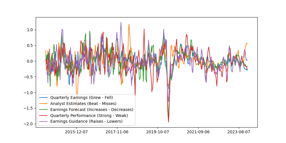 Secondly, there is a lot of cyclicality in text that relates to company performance. For example, when you look at the trend of snippets that relate to “beat analyst estimates” you can clearly see when we are in earnings seasons or not.
